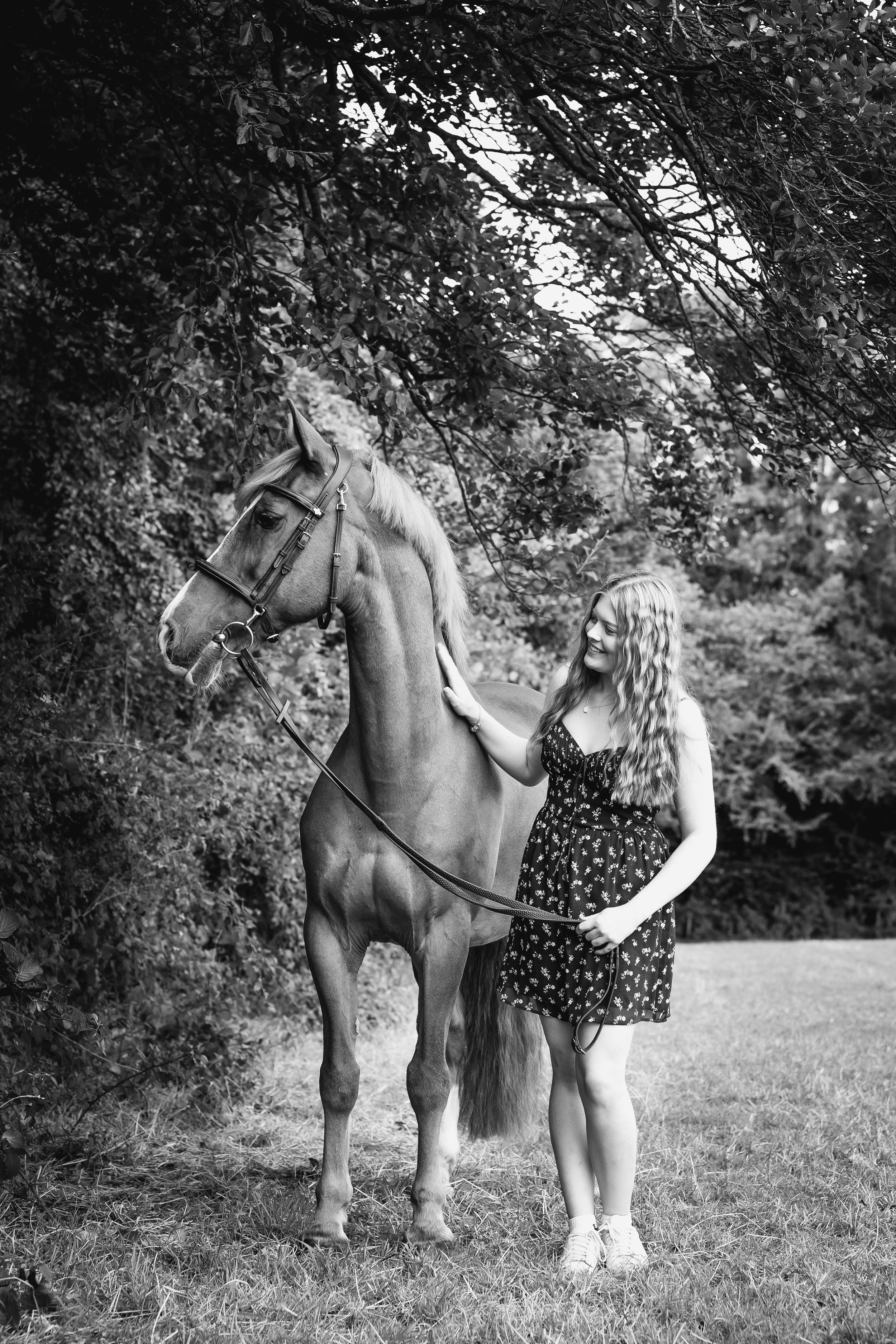 Outdoor horse and owner portraits are fantastic for capturing the special bond between a horse and its owner. Sarah will come to your yard or to an agreed-upon location for the shoot. This could be a forest, the beach, open fields, bluebell woods, lavender fields, or hay meadows — whichever setting best suits you and your horse. Any expenses or arrangements connected to the chosen location are to be covered by the horse owner. Outdoor shoots typically last around an hour, and if time allows, an outfit change can be arranged. These images are timeless and will become treasured memories to keep forever.